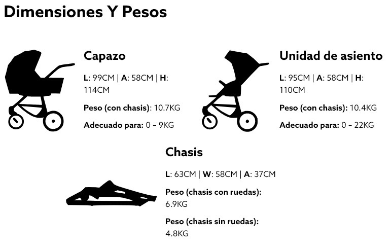Largo: 95 cmAncho: 58 cmAltura: 110 cmPeso con marco: 10,4 kgPeso del niño: hasta 22 kgCesta: