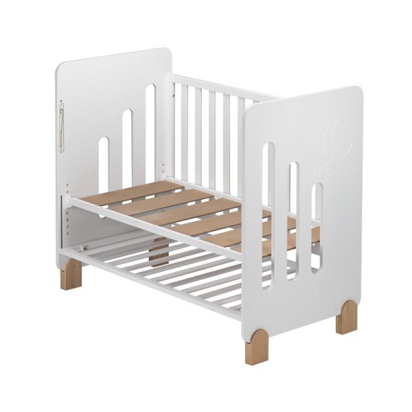 Es una bonita cuna de madera de haya procedente de bosques sostenibles, dos tonos, madera y blanco. Que ofrece la posibilidad de elegir entre patas de madera y ruedas para adaptarse a las necesidades de cada familia.