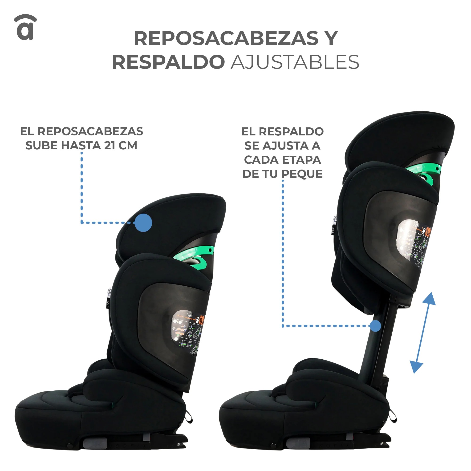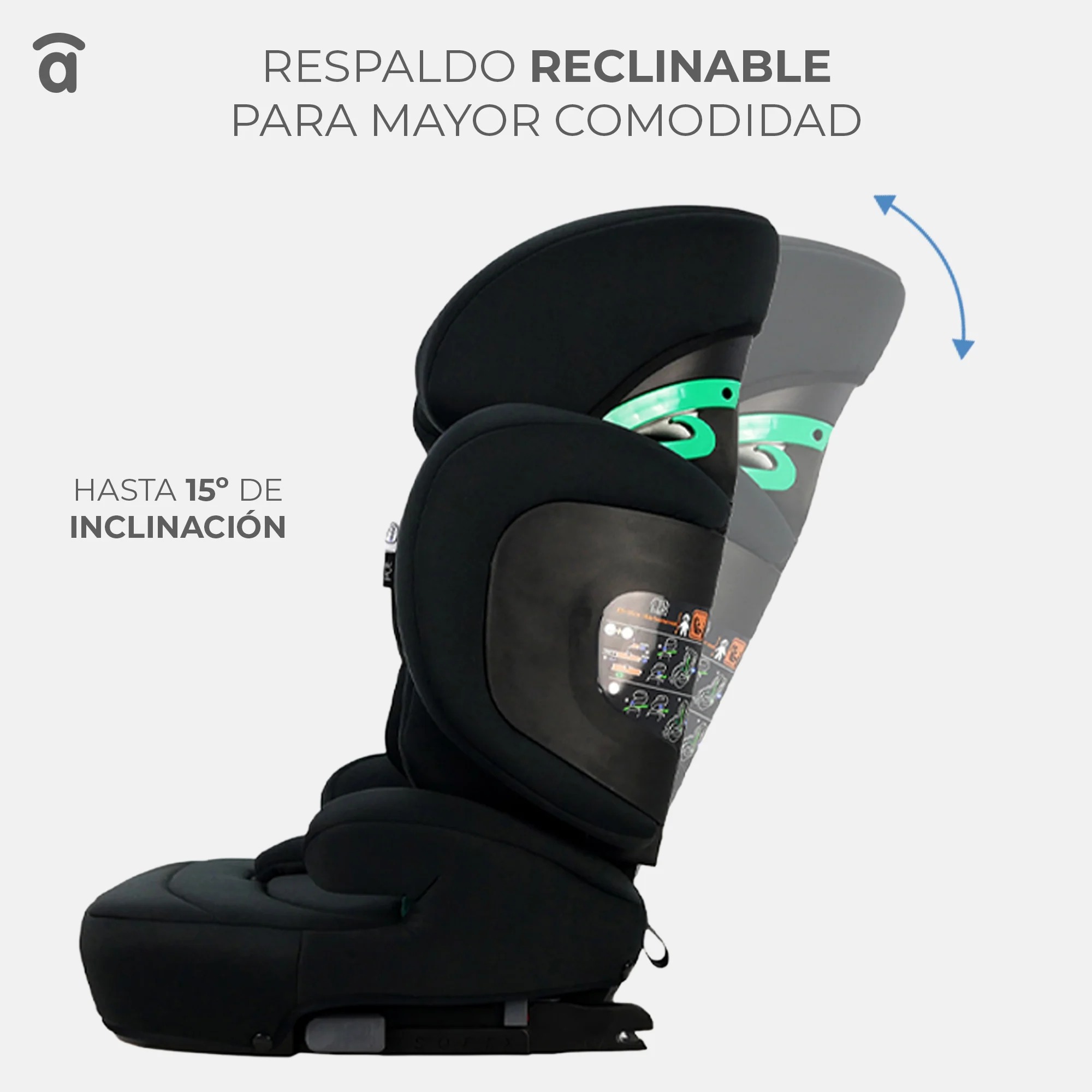 Silla de auto apta para uso desde los 100 y hasta los 150cm. El respaldo permite reclinación y se puede ensanchar el respaldo.