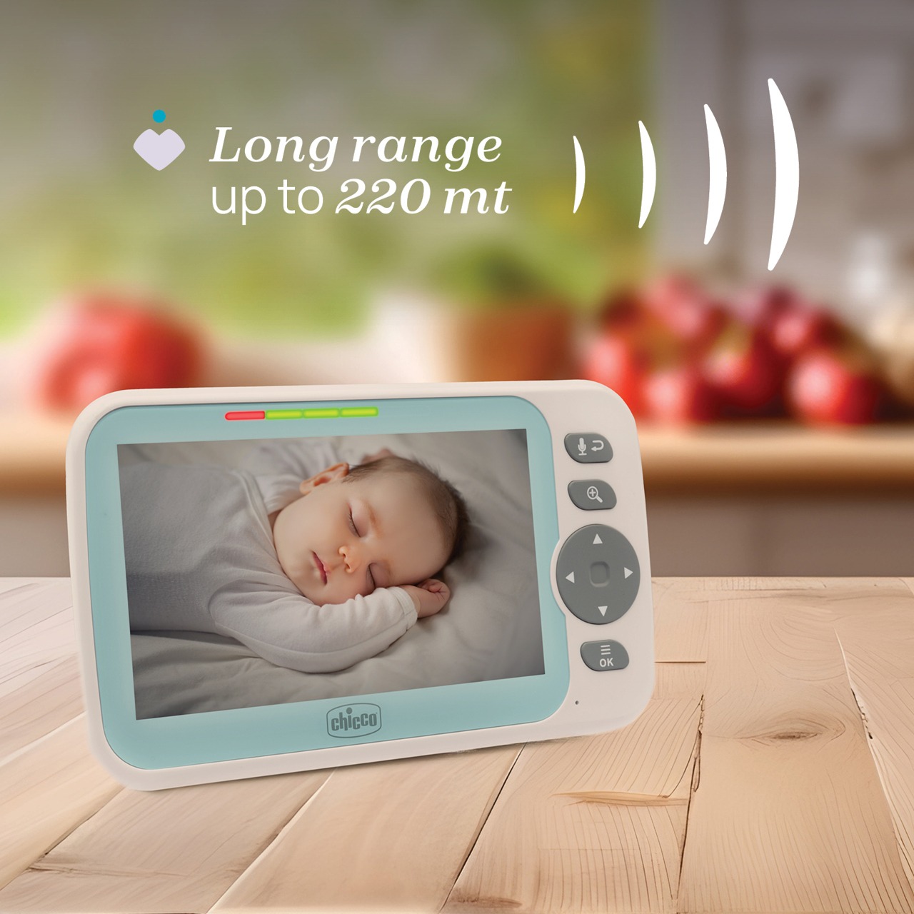 El vigilabebés tiene una cobertura exterior de hasta 220m (en condiciones óptimas en campo abierto sin obstáculos).